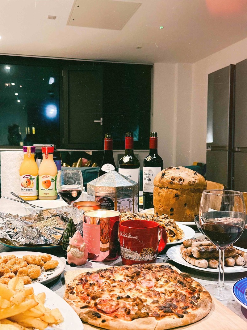 到了晚上,共用廚房裡早已在牆壁上掛著氣球、聖誕樹裝飾,餐桌上擺著香味四溢的鴛鴦鍋。一邊是麻辣湯頭,另一邊則是番茄鍋。牛肉片、豬肉片、腐竹、腐皮、魚丸、金針菇、白菜、海底撈沾醬擺滿了餐桌,恍若回到了台灣那些排隊名店的火鍋店。一問才知道,只要在附近的中超購買超過三十英鎊就可以免費租借幾天鴛鴦鍋具。